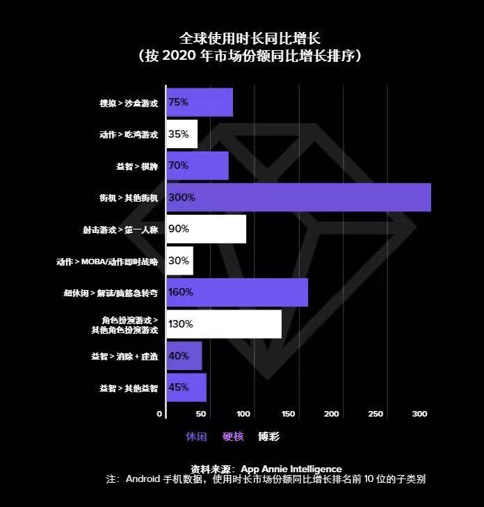 App Annie 的報告將游戲大致分為了 3 類:硬核游戲、休閑游戲和博彩游戲。過去一年,一些重度游戲和更輕的超休閑游戲都有“往中度走”的趨勢出現,推動了休閑游戲的發(fā)展。